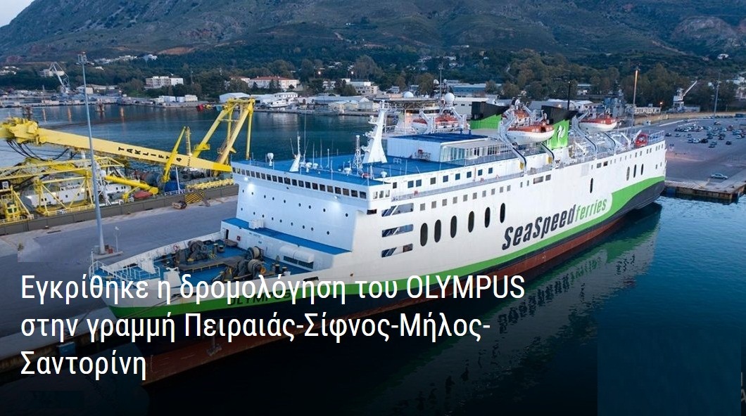 Το Συμβούλιο Ακτοπλοϊκών Συγκοινωνιών (Σ.Α.Σ.) ενέκρινε προχθές τη νέα γραμμή του πλοίου «OLYMPUS» της Sea Speed Ferries για το δρομολόγιο Πειραιάς –Σίφνος – Μήλος – Σαντορίνη και επιστροφή.