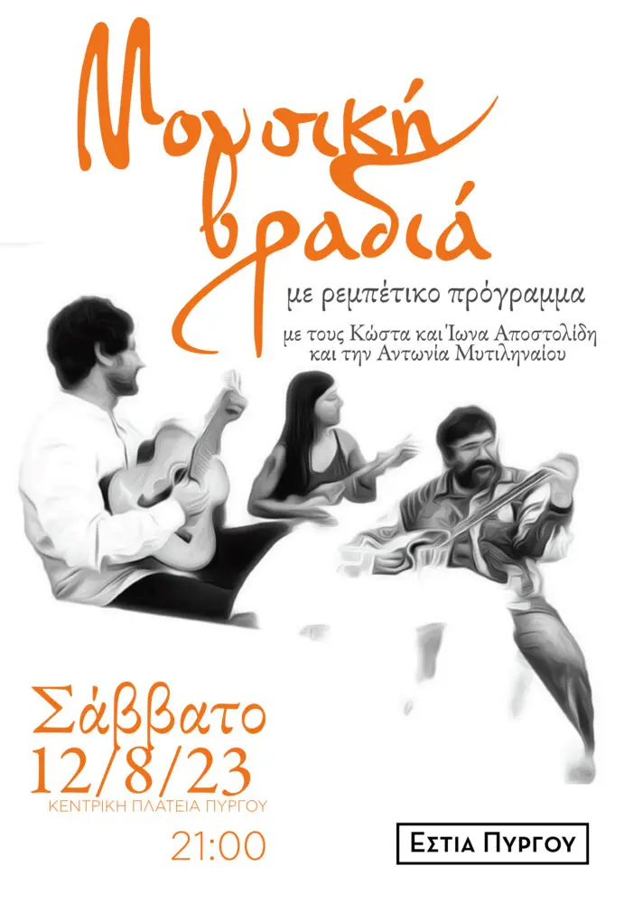 Μουσική βραδιά με ρεμπέτικο πρόγραμμα με τους Κώστα και Ίωνα Αποστολίδη και την Αντωνία Μυτιληναίου απο την Εστία του Πύργου.