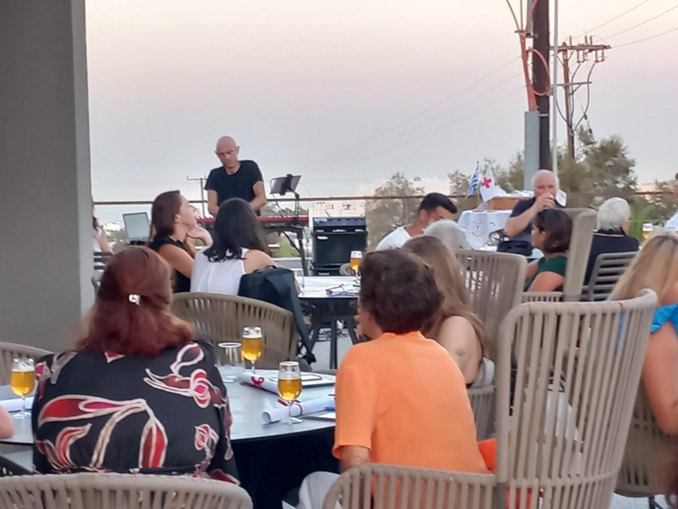Ιδιαίτερα ευχαρίστησε τη Ζυθοποιία ΦΤΕΛΟΣ για τη φιλοξενία και την περιποίηση από το προσωπικό της και τον αξιόλογο ως  μουσικό και άνθρωπο, πιανίστα Μιχάλη Κατσαρό , που γέμισε την βραδιά με όμορφες μουσικές.