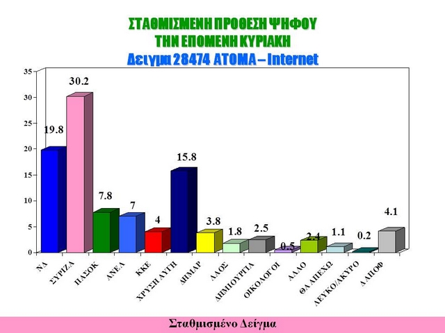 Σχετικά με την επικράτεια στο Zougla.gr και σε δείγμα 28.557 ατόμων εμφανίζεται πρώτο κόμμα καθαρά πλέον ο ΣΥΡΙΖΑ με 30,2% και ακολουθεί η Νέα Δημοκρατία με 19,8%. Έκλπηξη προκαλεί η Τρίτη θέση την οποία φαίνεται να καταλαμβάνει η Χρυσή Αυγή με 15,8% . Στην παρακάτω καρτέλα εμπεριέχονται τα ποσοστά που λαμβάνουν όλα τα κόμματα.